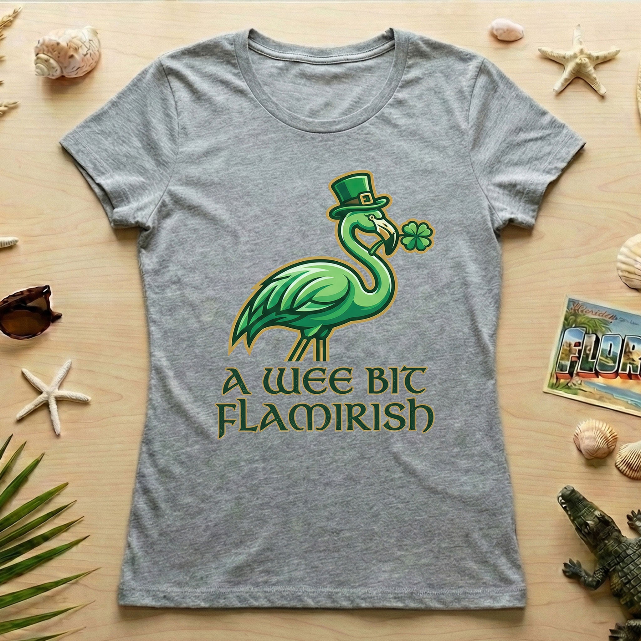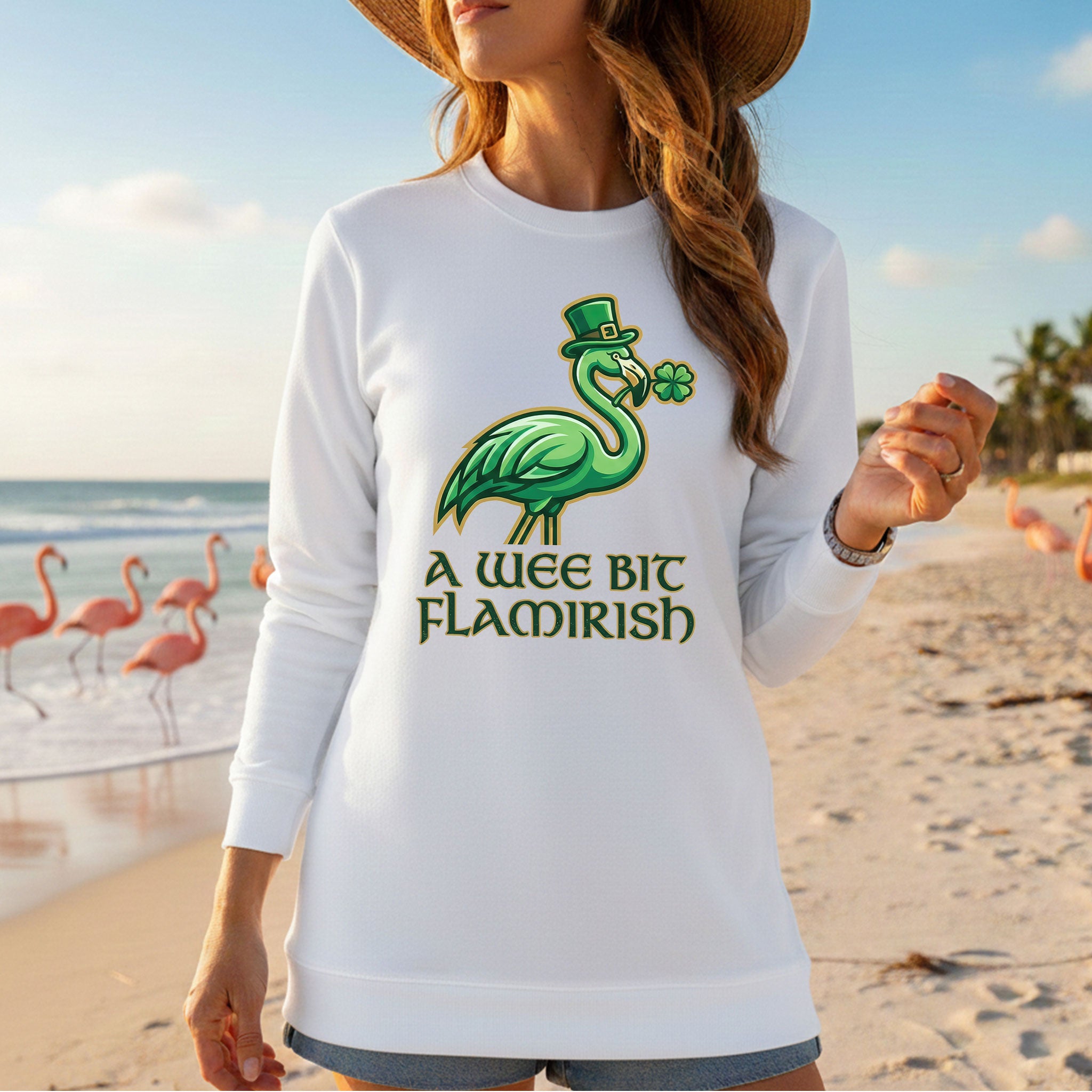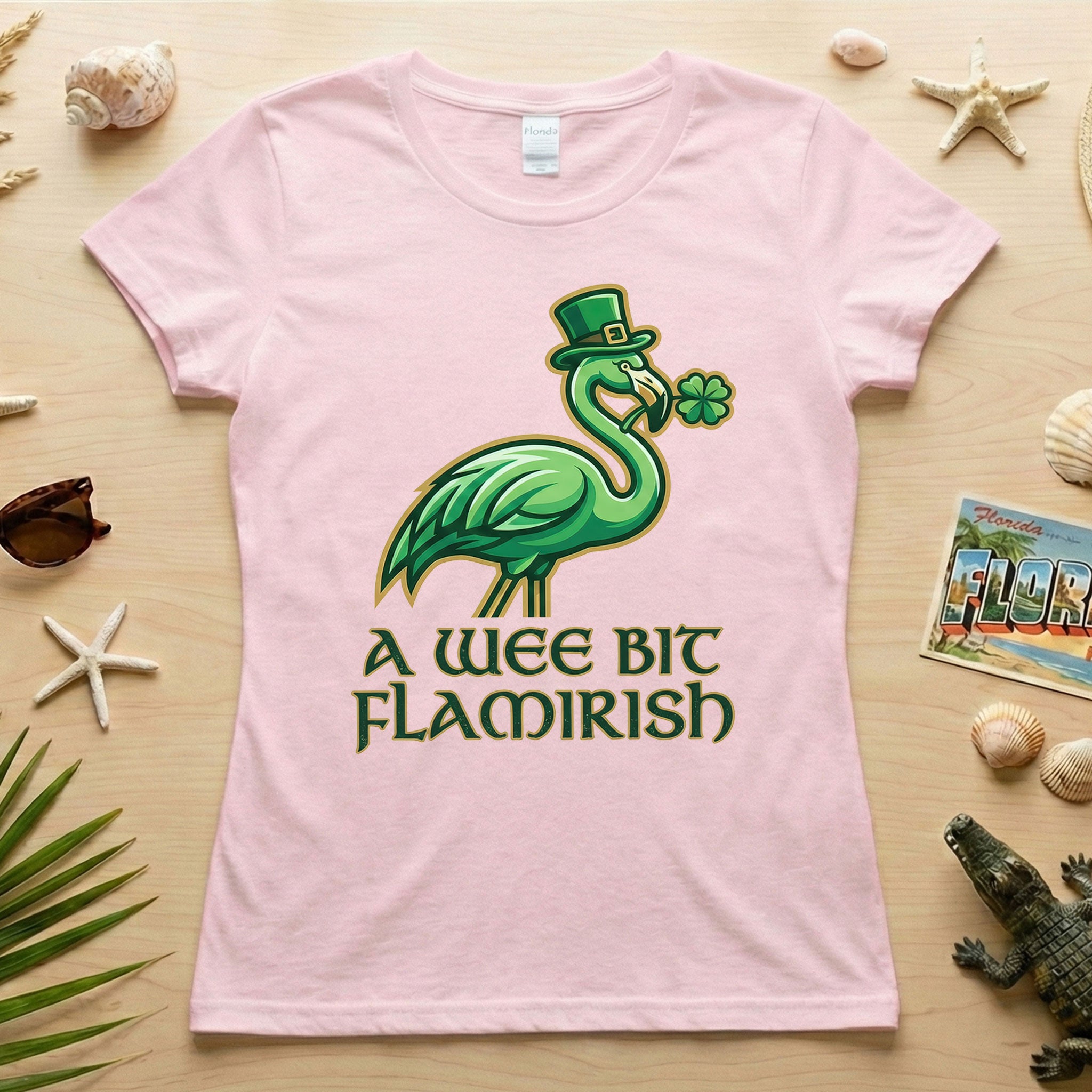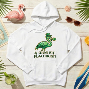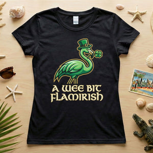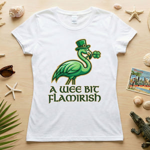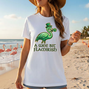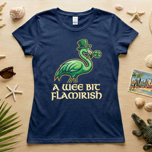 Hello, fellow Flamingo Fanatics! Are you ready to add a splash of unique charm and a whole lot of giggles to your St. Patrick's Day celebrations? Our exclusive 'A Wee Bit Flamirish' t-shirt is here to make sure you stand out with whimsical style. It's the perfect blend of Irish cheer and your favorite feathered friend, designed for the woman who loves to celebrate with a smile and a touch of individuality.