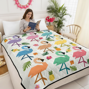 Fran, if your bedroom needs a burst of cheerful color and modern tropical flair, this is it! Our vibrant patchwork quilt captures the fun of the tropics using bold, geometric flamingos and playful accents like pineapples and hibiscus flowers. Drape this ultra-soft, smooth blanket over your bed or sofa and instantly transform your space into a sunny, stylish sanctuary that reflects your fun-loving personality.
