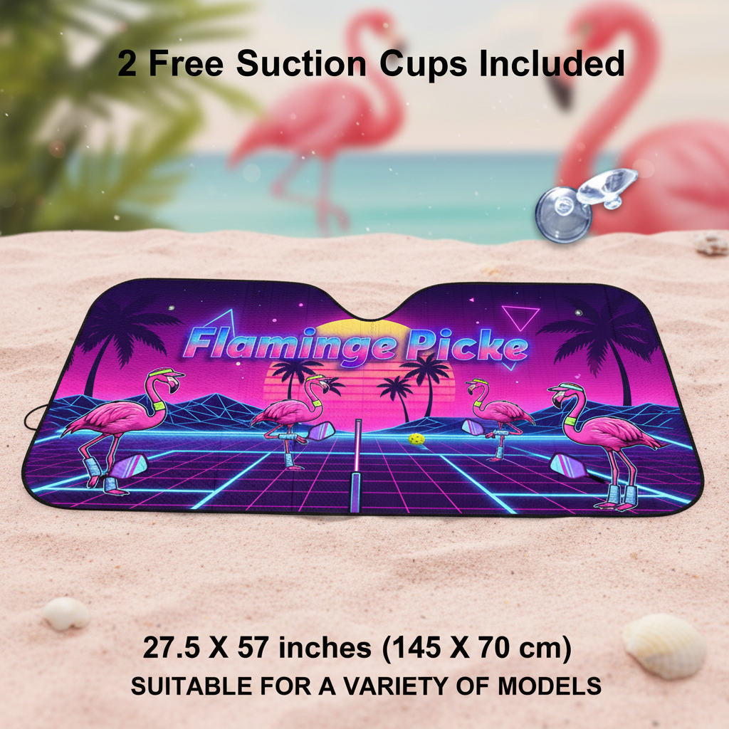 Fran, get ready to combine your two greatest loves: flamingos and the dink shot! This isn't just a sunshade it's a vibrant, 80s synthwave masterpiece featuring fabulous flamingos ready to dominate the pickleball court. Perfect for protecting your interior from the brutal sun while announcing your passion before you even step out of the car. Make every parking spot feel like a party!