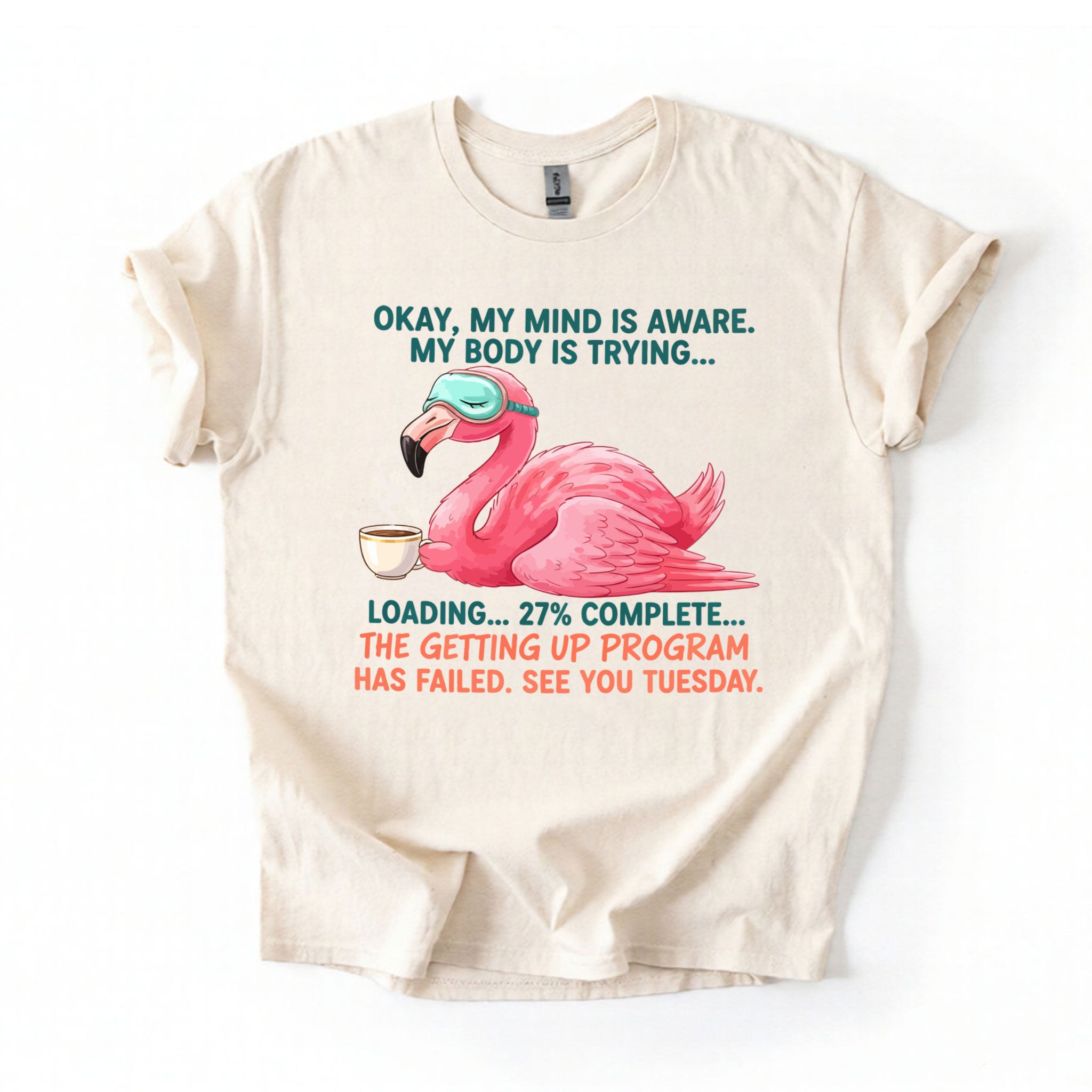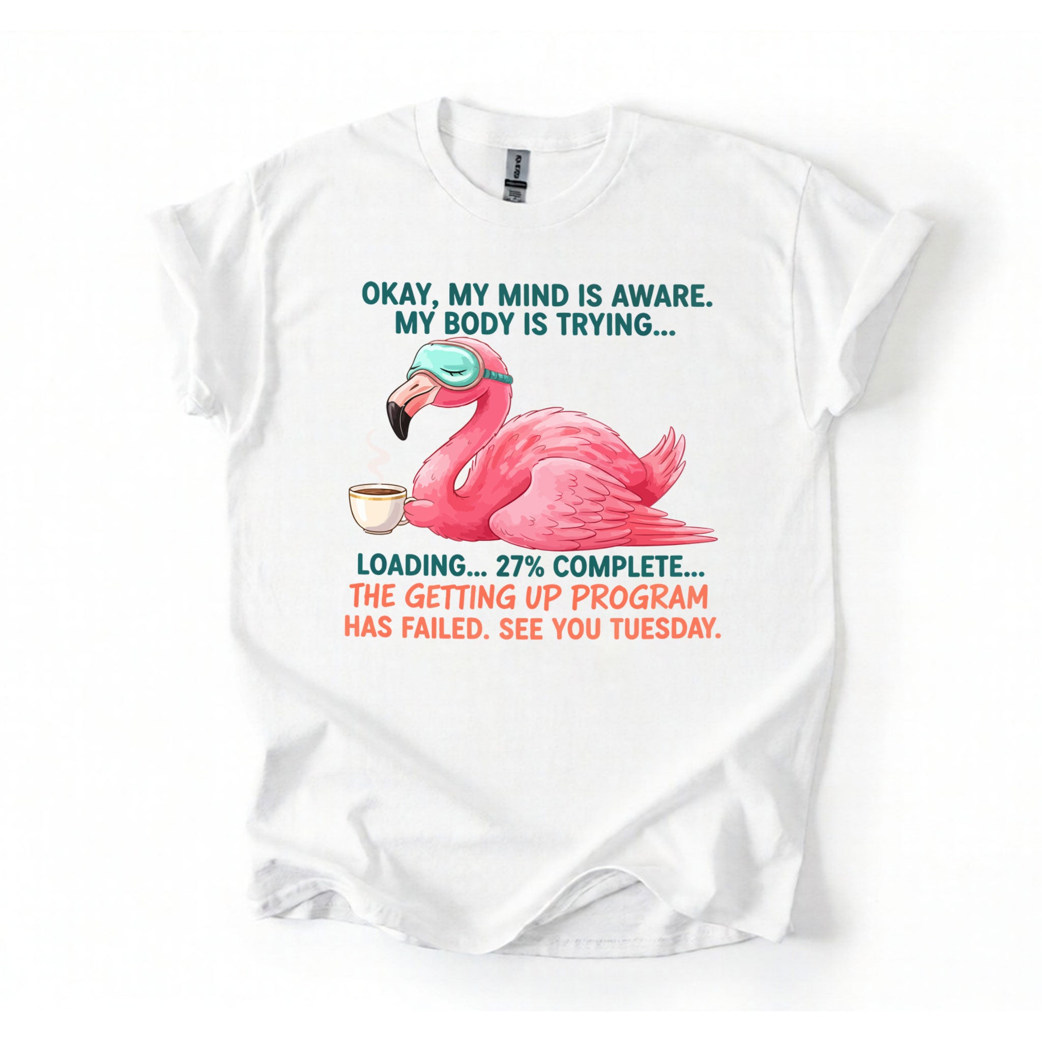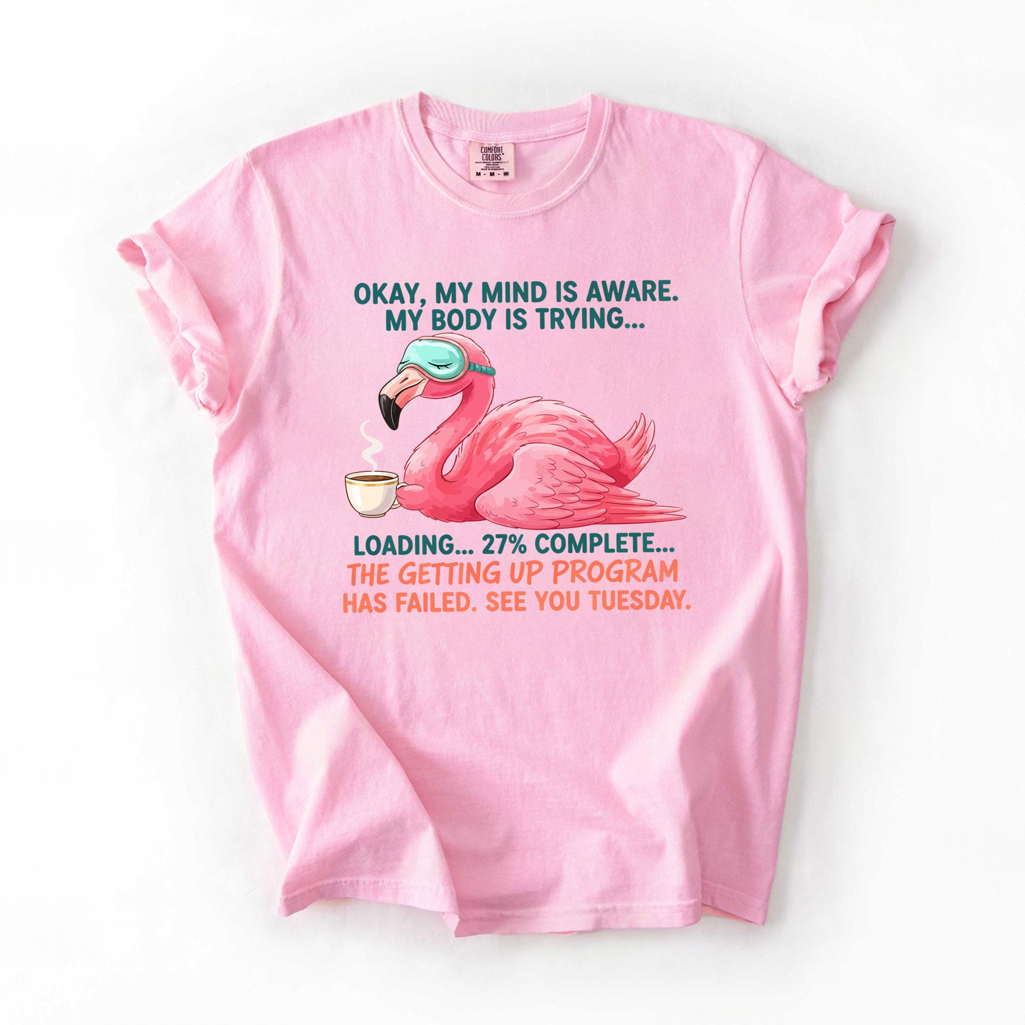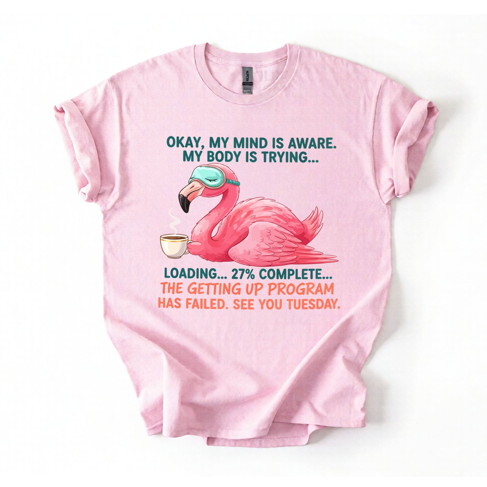 Iconic Tired Design: Our flamingo knows the struggle! The illustration is detailed, featuring beautiful shades of coral pink, a cute teal sleep mask, and text that reads: "OKAY, MY MIND IS AWARE. MY BODY IS TRYING... LOADING... 27% COMPLETE... THE GETTING UP PROGRAM HAS FAILED. SEE YOU TUESDAY."
