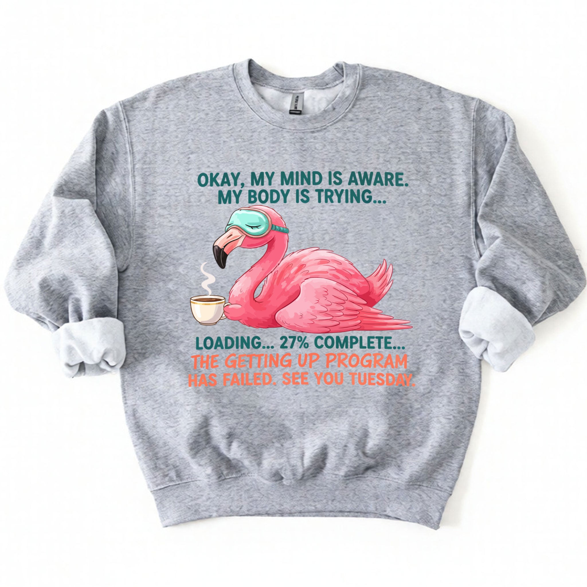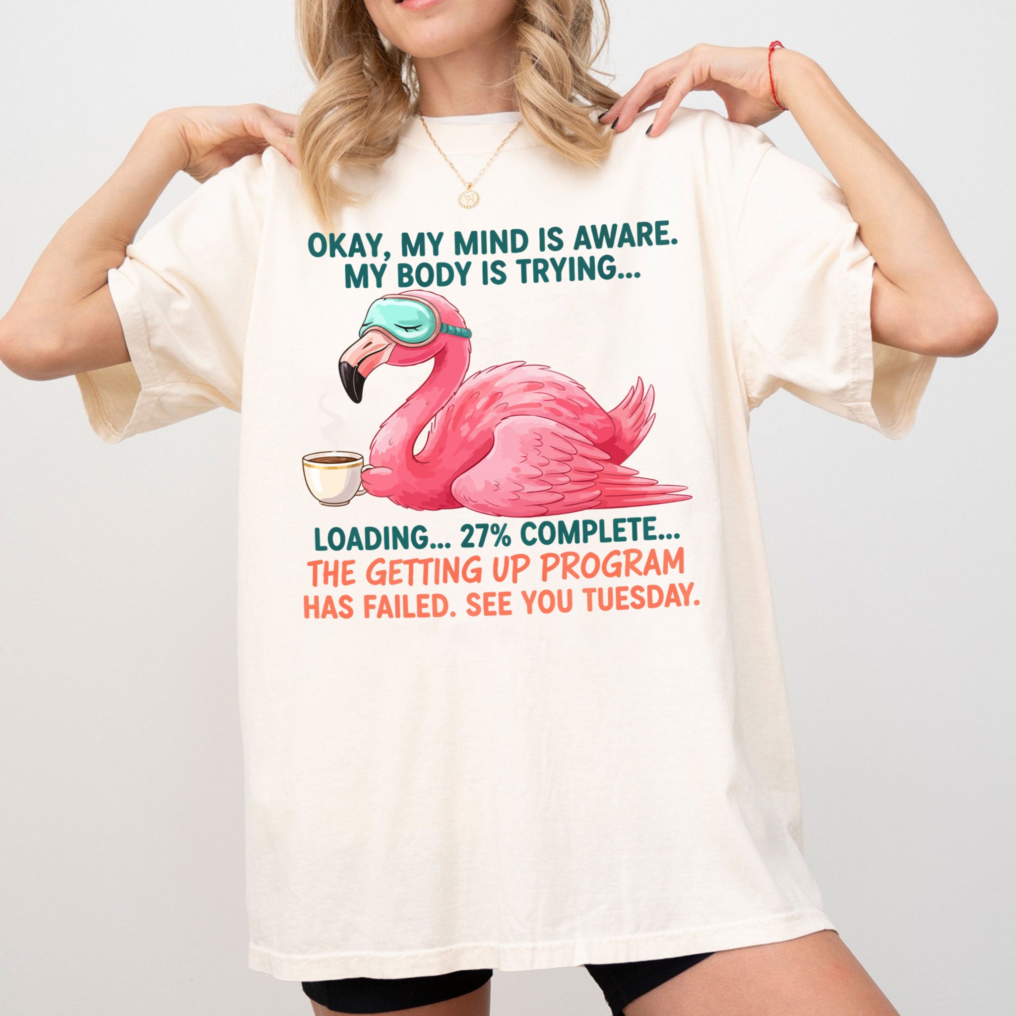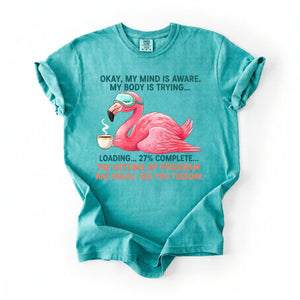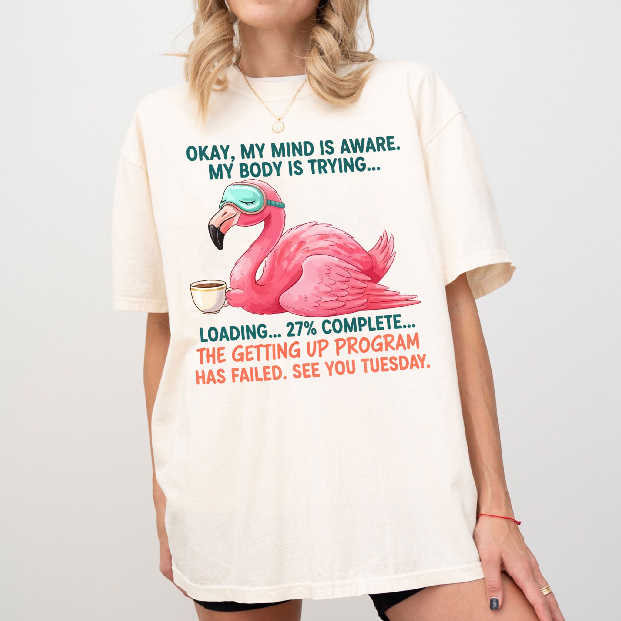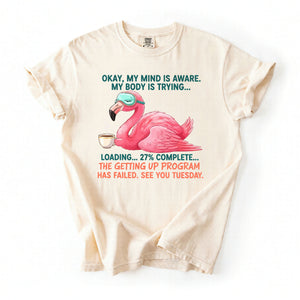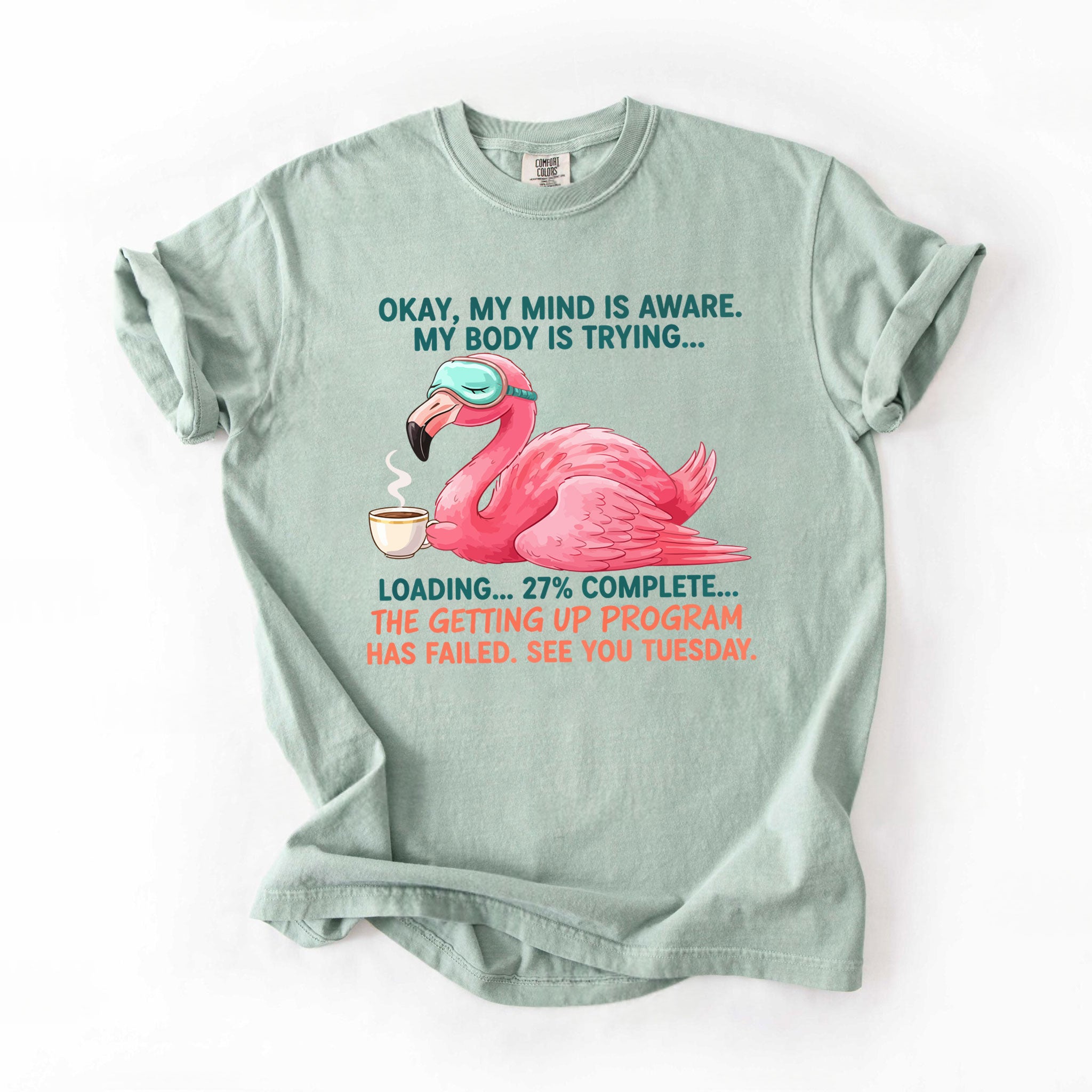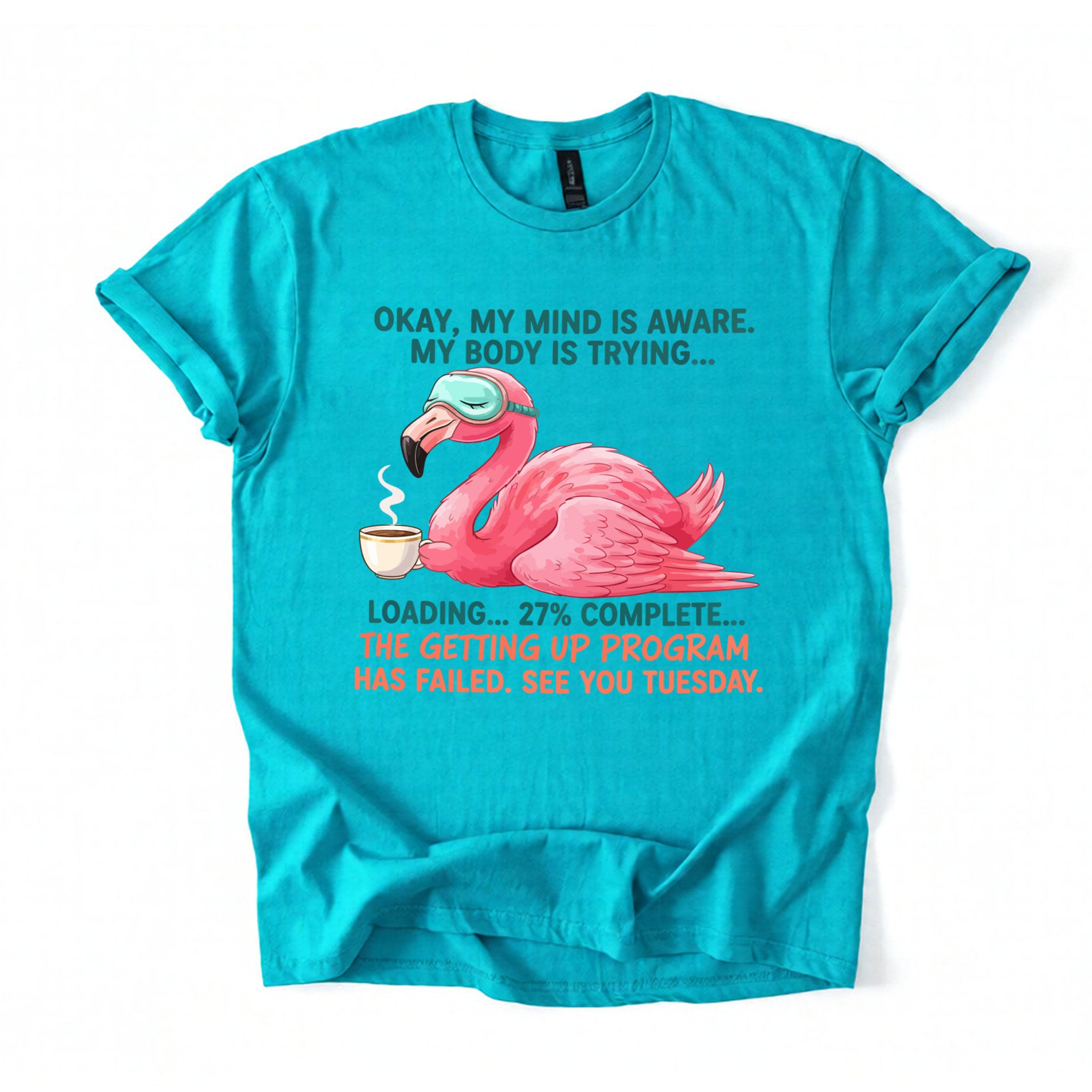 Iconic Tired Design: Our flamingo knows the struggle! The illustration is detailed, featuring beautiful shades of coral pink, a cute teal sleep mask, and text that reads: "OKAY, MY MIND IS AWARE. MY BODY IS TRYING... LOADING... 27% COMPLETE... THE GETTING UP PROGRAM HAS FAILED. SEE YOU TUESDAY."