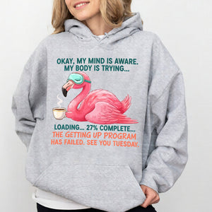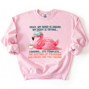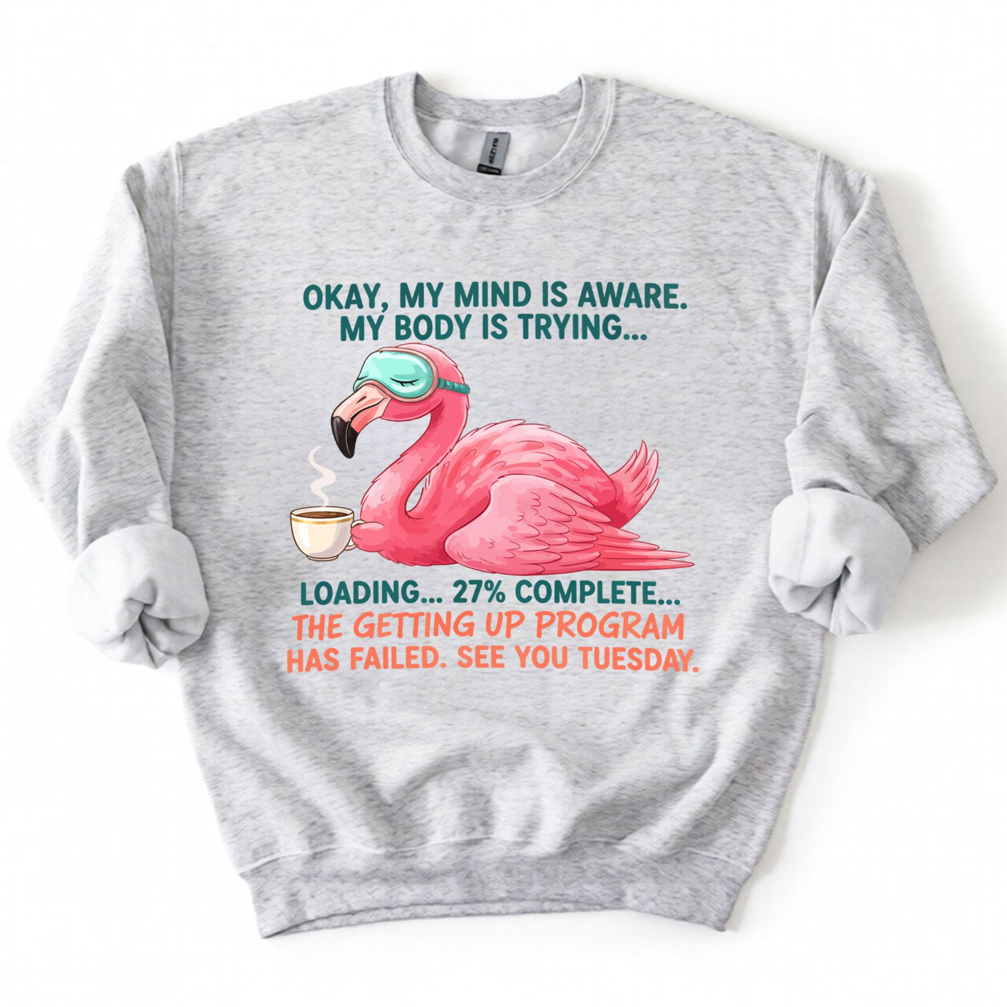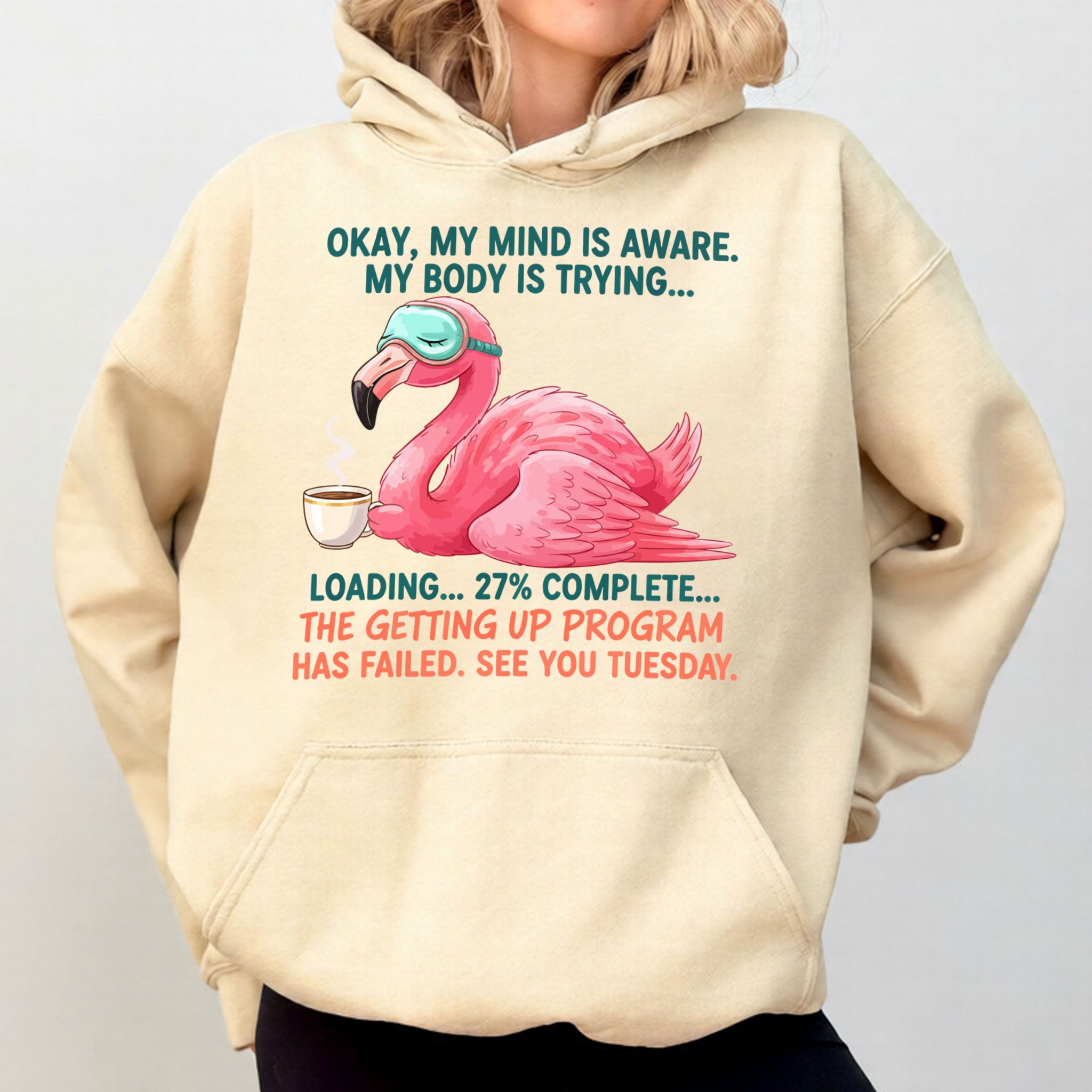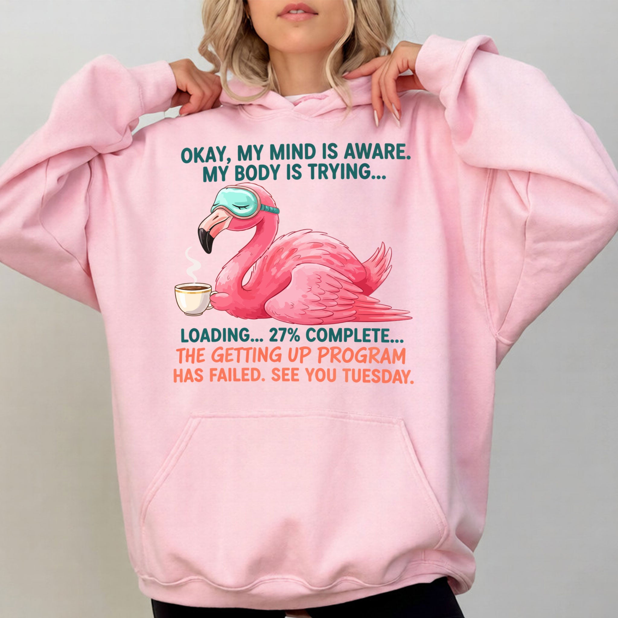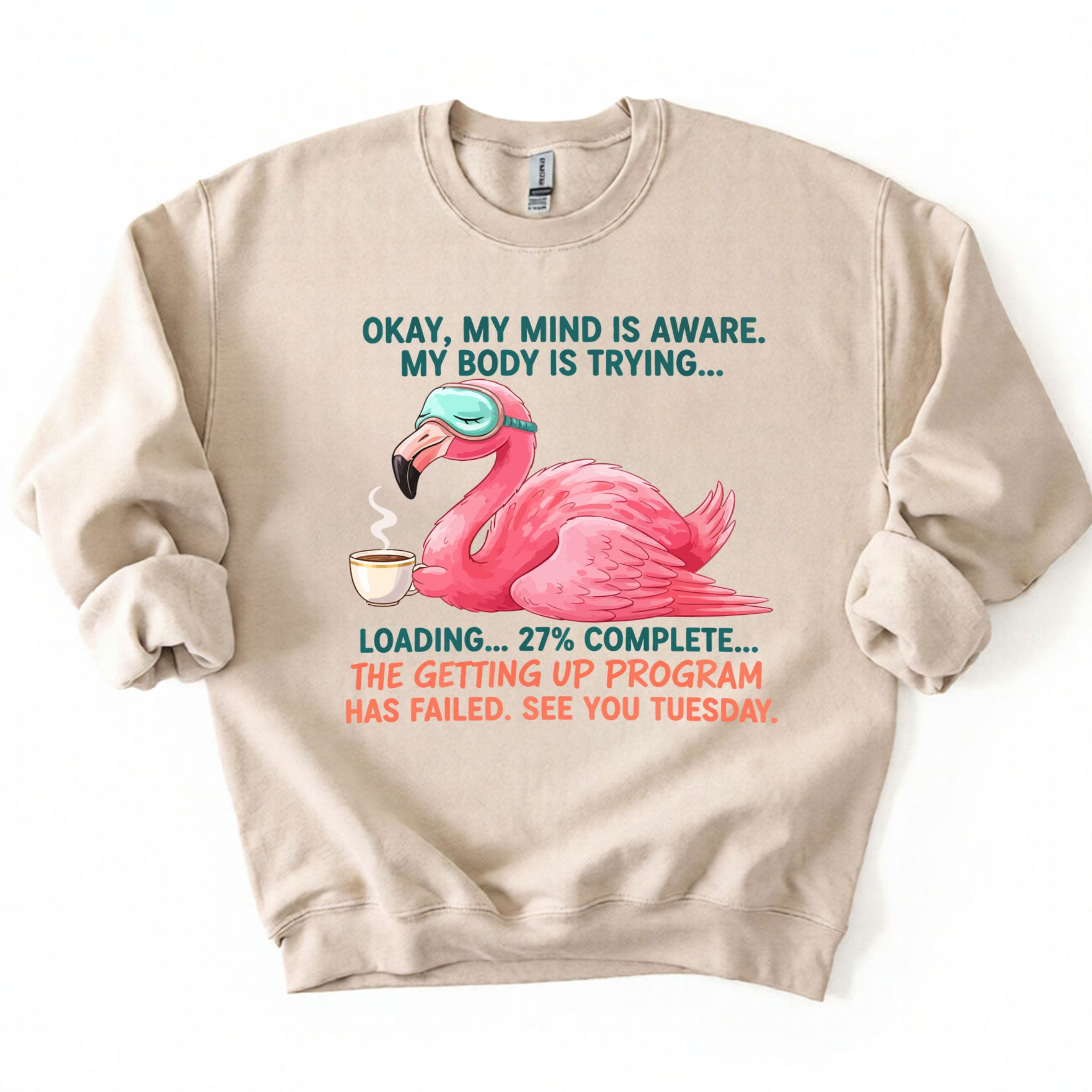 Iconic Tired Design: Our flamingo knows the struggle! The illustration is detailed, featuring beautiful shades of coral pink, a cute teal sleep mask, and text that reads: "OKAY, MY MIND IS AWARE. MY BODY IS TRYING... LOADING... 27% COMPLETE... THE GETTING UP PROGRAM HAS FAILED. SEE YOU TUESDAY."