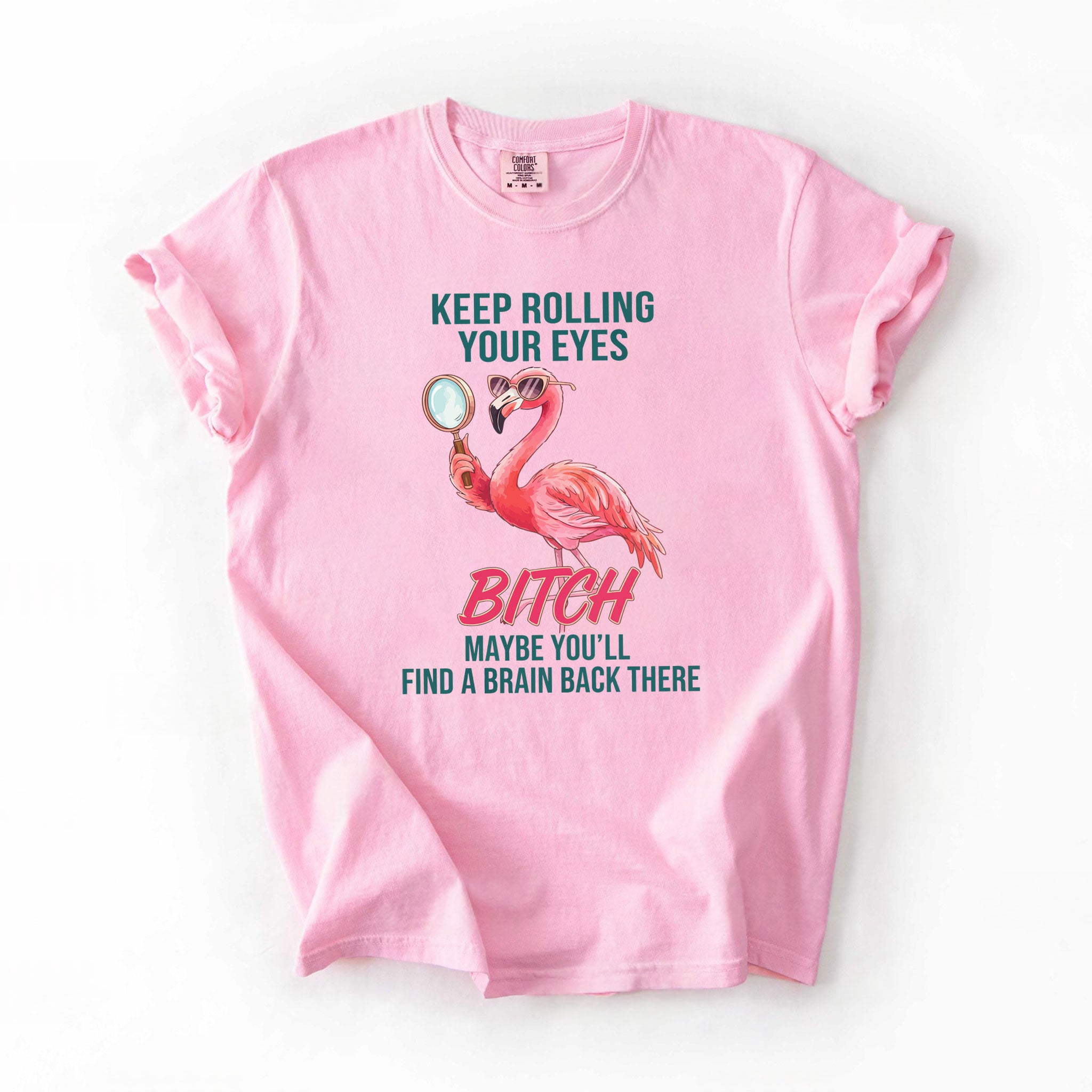 Vibrant Graphic: The bold coral pink flamingo, sharp teal text, and soft bubblegum shirt color make this design truly pop and stand out from the flock.