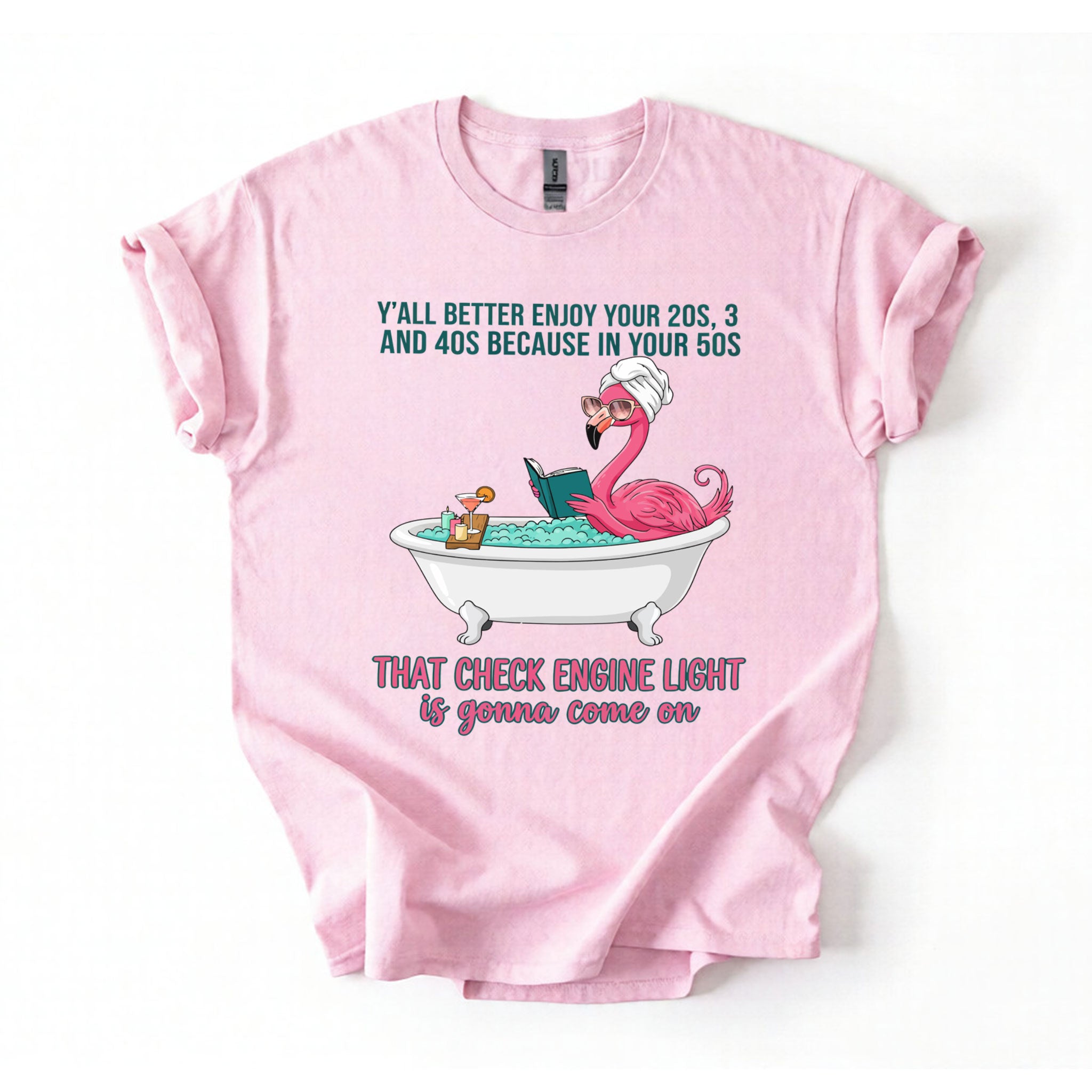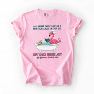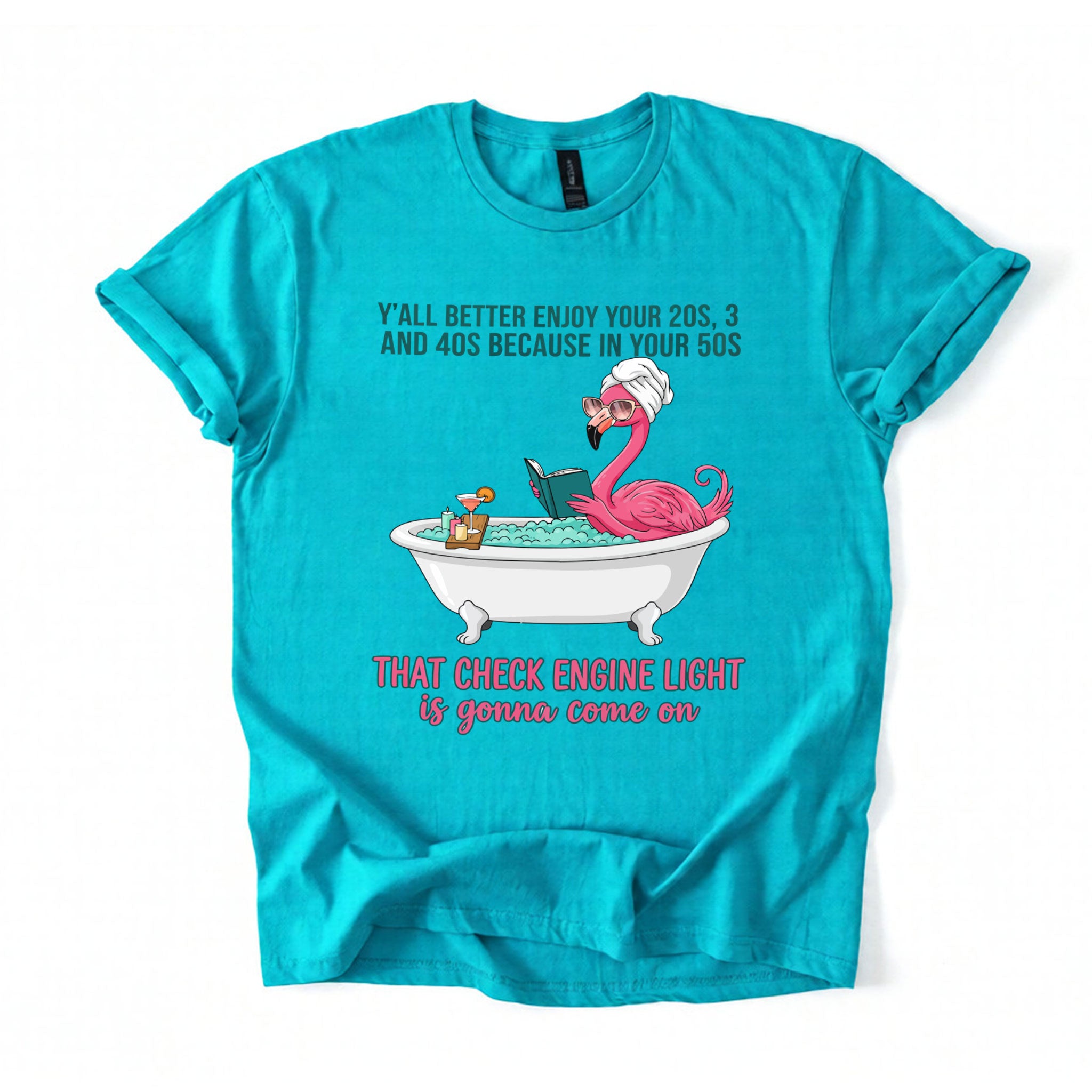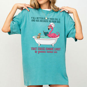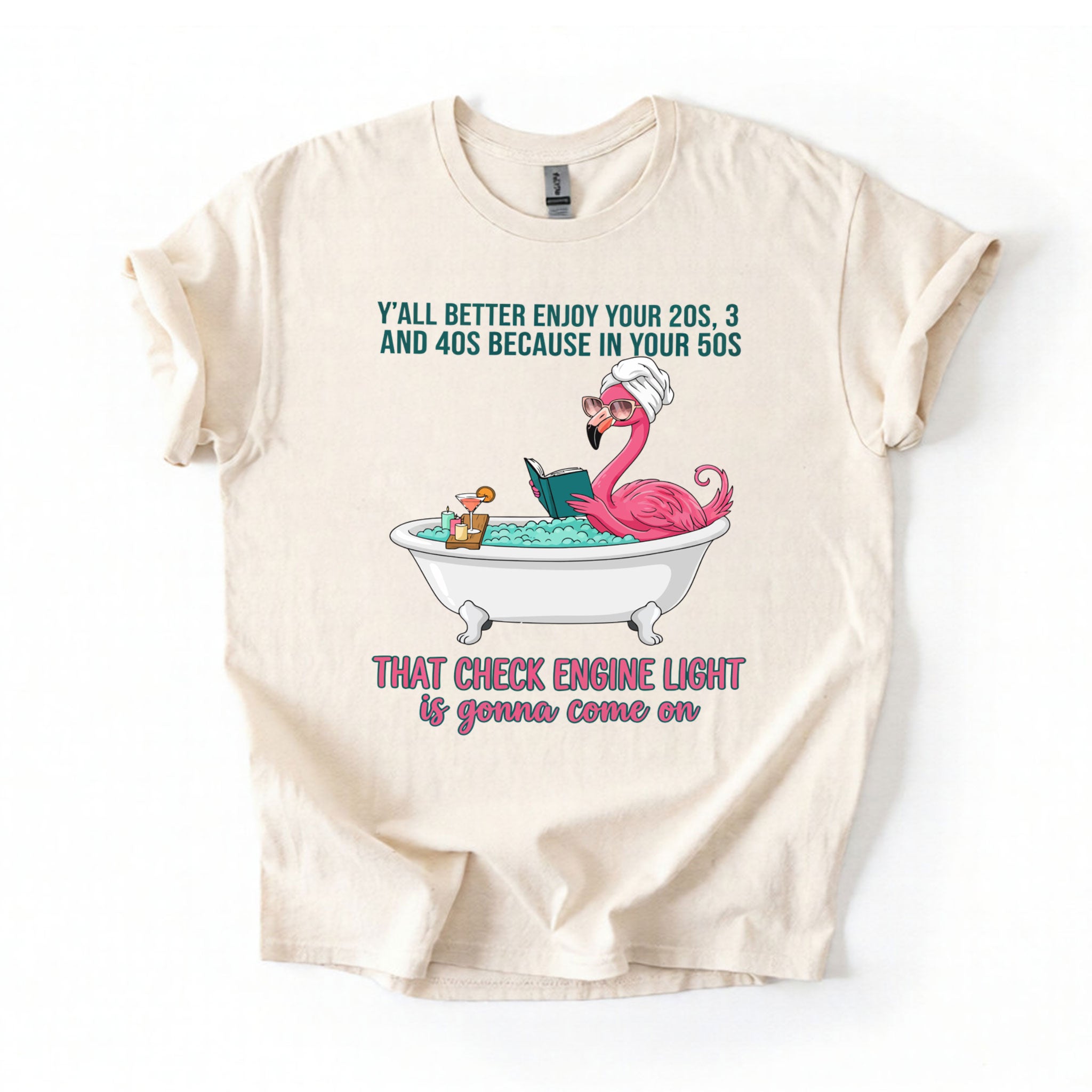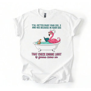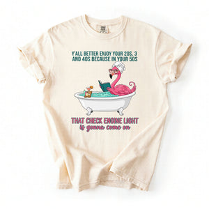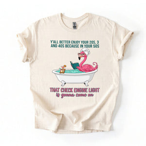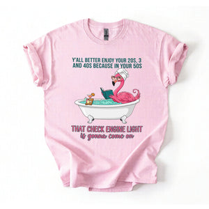 Fran, if you've earned your stripes and maybe a few aches along the way, this tee is your official uniform! We’ve captured the pure bliss of a seasoned woman a flamingo soaking in a clawfoot tub, wearing sunglasses and a spa wrap, fully prepared for the body’s occasional dashboard warning. It’s sassy, it’s vibrant, and it tells the truth about life after 40 with a tropical twist of humor. Don't worry, honey we all have a little mileage on the odometer!