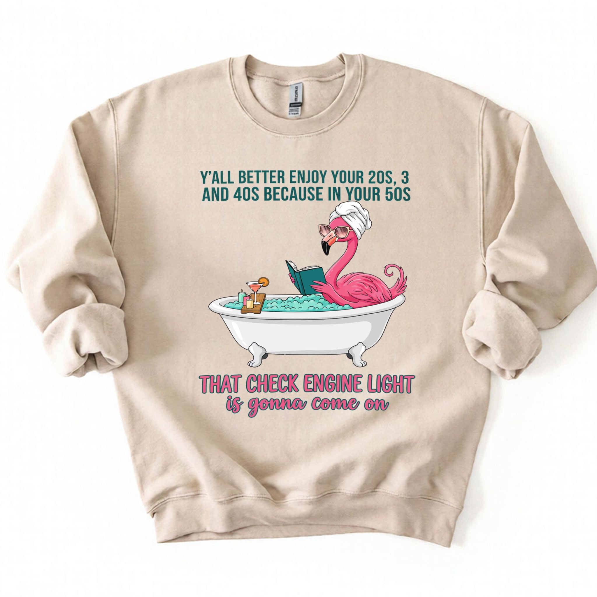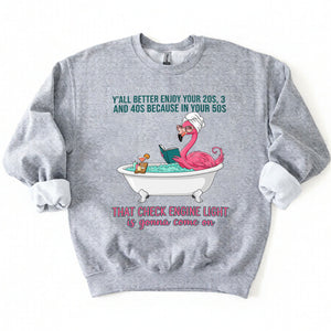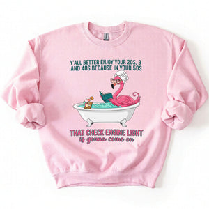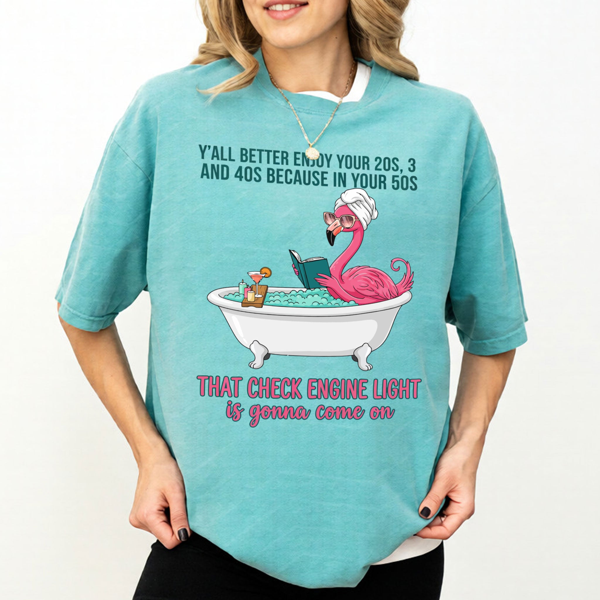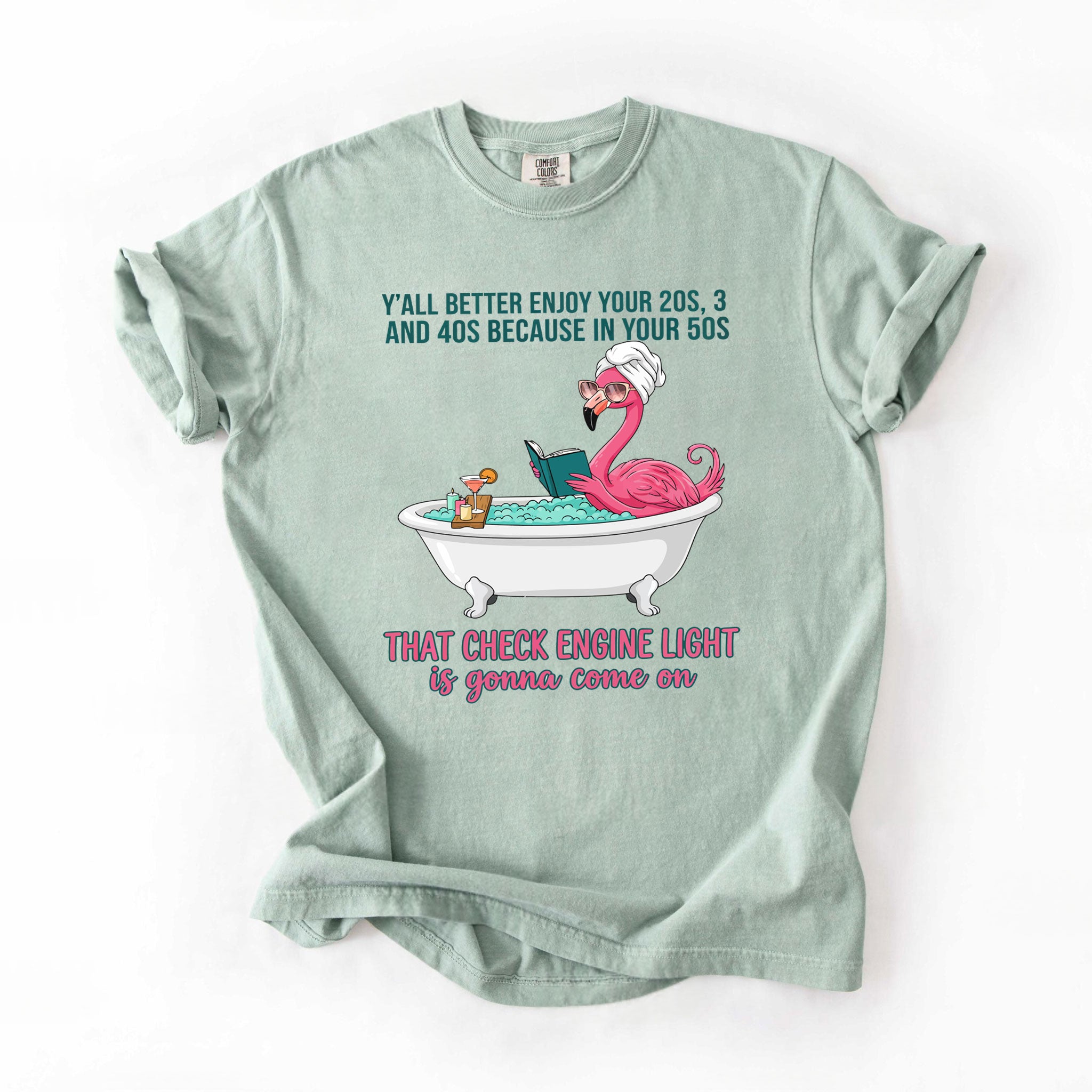 Fran, if you've earned your stripes and maybe a few aches along the way, this tee is your official uniform! We’ve captured the pure bliss of a seasoned woman a flamingo soaking in a clawfoot tub, wearing sunglasses and a spa wrap, fully prepared for the body’s occasional dashboard warning. It’s sassy, it’s vibrant, and it tells the truth about life after 40 with a tropical twist of humor. Don't worry, honey we all have a little mileage on the odometer!