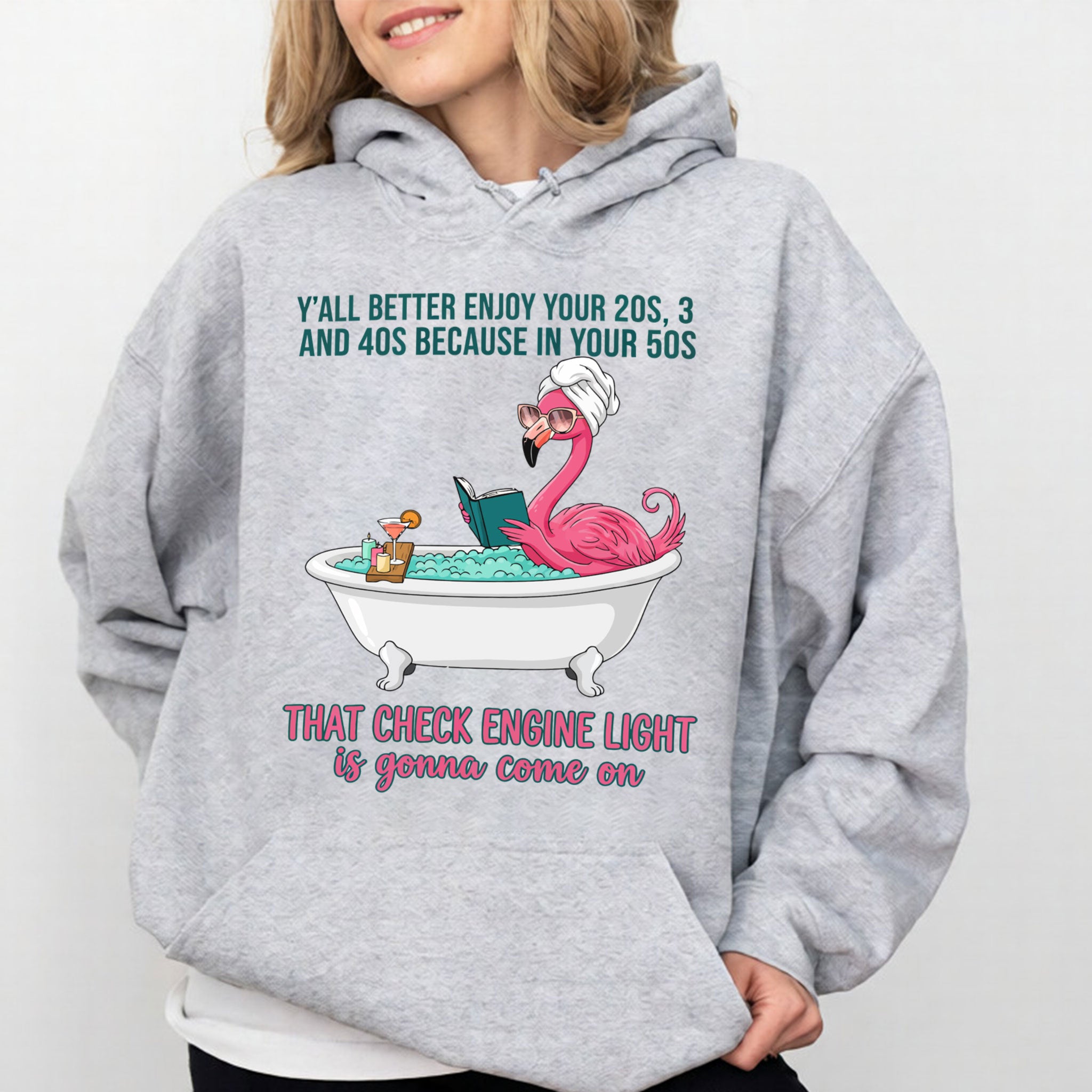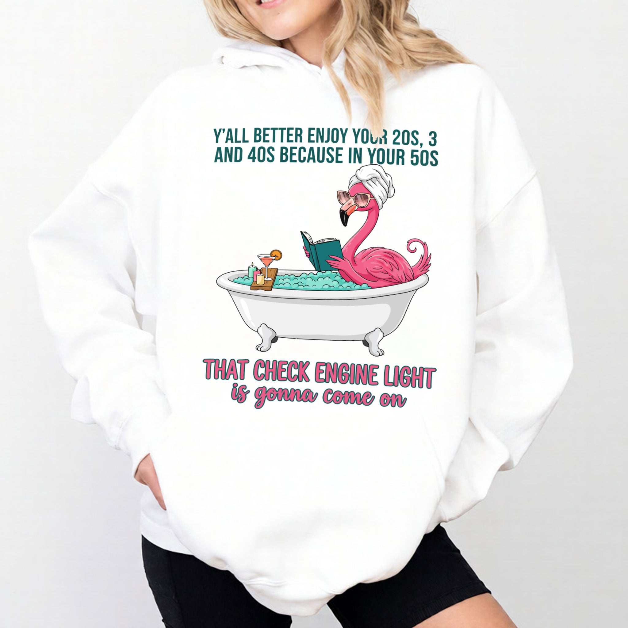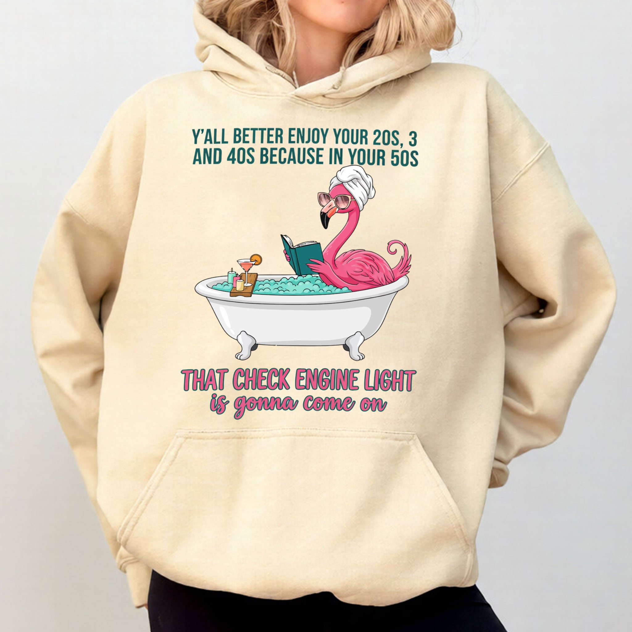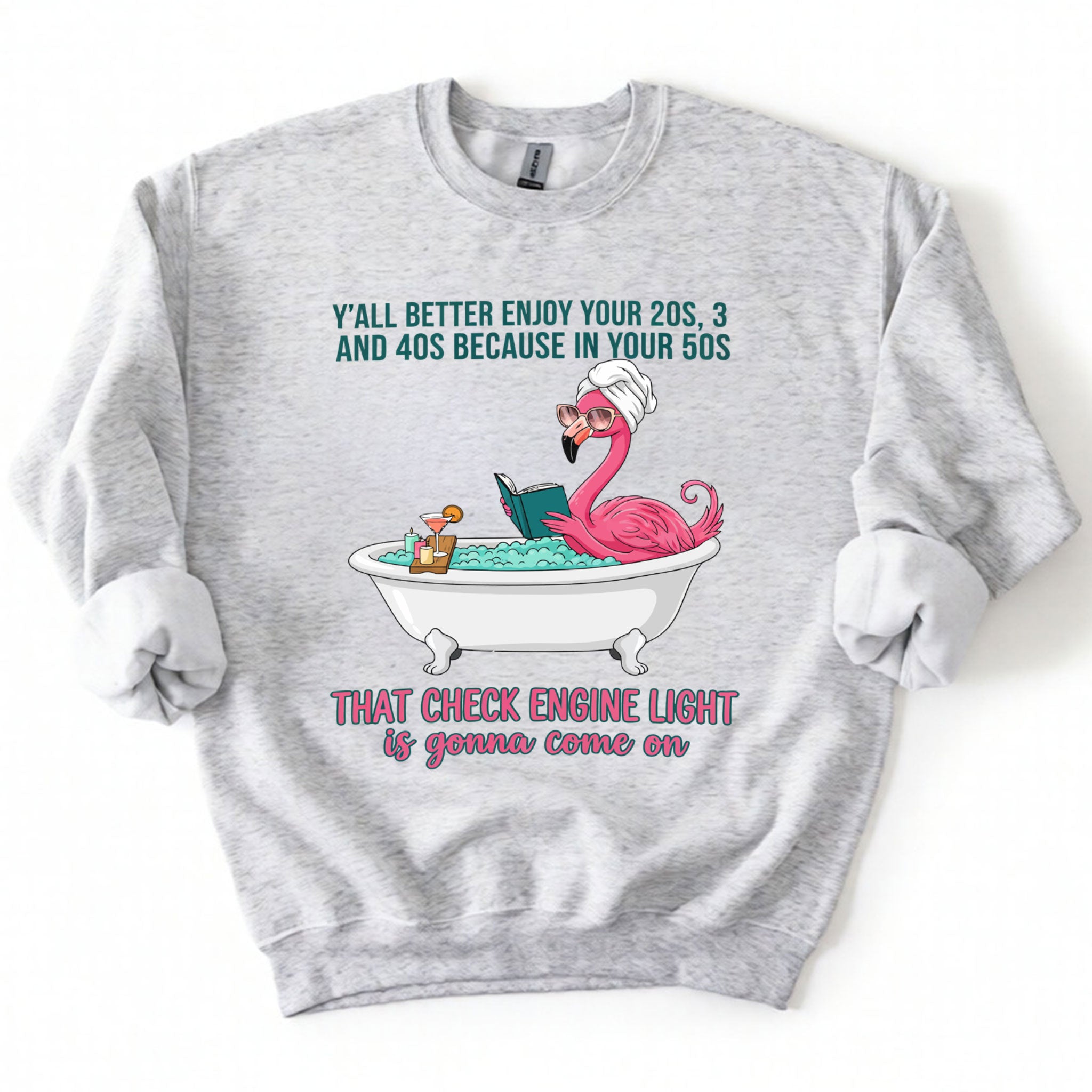 Fran, if you've earned your stripes and maybe a few aches along the way, this tee is your official uniform! We’ve captured the pure bliss of a seasoned woman a flamingo soaking in a clawfoot tub, wearing sunglasses and a spa wrap, fully prepared for the body’s occasional dashboard warning. It’s sassy, it’s vibrant, and it tells the truth about life after 40 with a tropical twist of humor. Don't worry, honey we all have a little mileage on the odometer!